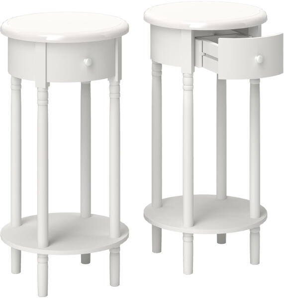 HOMCOM 2 részes éjjeliszekrény szett - Stílus és funkcionalitás egyben! ✨ Varázsolj otthonodba egy kis retró hangulatot ezzel a stílusos HOMCOM éjjeliszekrény szettel! Tökéletes választás hálószobába éjjeliszekrényként, de akár a nappaliban dohányzóasztalként is megállja a helyét. A szett két darab azonos kialakítású asztalkát tartalmaz. Főbb jellemzők:2 darabos szett: Két éjjeliszekrény/dohányzóasztal a szettben. Fiók és polc: Praktikus tárolási lehetőségek a szükséges holmik számára. ? Elegáns design: Faragott fehér keret, amely bármely helyiségnek stílusos megjelenést kölcsönöz. ? Könnyen tisztítható: Lakkozott felület a könnyű karbantartásért. ? Padlóvédelem: Csúszásgátló talpak a padló karcolódásának elkerülése érdekében. ?️ Méretek és anyag:Jellemző ÉrtékSzín FehérAnyag MDFTeljes méret Ø35,5 x 71 cmFiók belső mérete 12,7 x 22 x 7,6 cmPolc mérete Ø35 cmPolc magassága 50 cm (felülről)Láb magassága 12 cmTeherbírás 50 kg (teljes), 10 kg (fiók)A csomag tartalma: 2 db fiókos éjjeliszekrény 1 db használati útmutató Ezzel a HOMCOM éjjeliszekrény szettel nem csak egy praktikus bútordarabot kapsz, hanem egy stílusos kiegészítőt is, amely feldobja otthonod hangulatát! ?