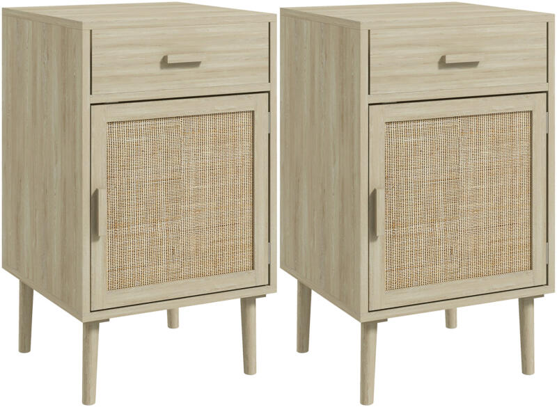 HOMCOM Rattan Éjjeliszekrény Szett (2 db): Bohém stílus és praktikus tárolás ?️ Ez a 2 darabos HOMCOM éjjeliszekrény szett tökéletes választás, ha extra tárolóhelyre van szükséged a hálószobádban vagy a nappalidban. A rattan ajtófrontok és a természetes fa fogantyúk bohém és modern hangulatot kölcsönöznek otthonodnak. Főbb jellemzők:2 darabos szett: Szimmetriát és stílust visz a szobába. Rattan dizájn: Kifinomult megjelenés, mely kiemeli otthonod dekorációját. Sokoldalú felhasználás: Éjjeliszekrényként, kanapé melletti asztalként is használható. Tárolási lehetőségek:Fiók: Könyvek, lámpák, tollak vagy egyéb szükséges holmik tárolására. Szekrény: 3 szintes, állítható polccal a különböző méretű tárgyak számára. Lapos asztallap: További hely a dekorációk vagy a mindennapi használati tárgyak számára. További előnyök:Megemelt lábak: Könnyű tisztán tartás és a tárgyak szárazon tartása. Tartós anyag: Melamin borítású forgácslap a hosszú élettartamért és a könnyű tisztíthatóságért. Műszaki adatok:Jellemző ÉrtékSzín Természetes fahatásúAnyagok Forgácslap, rattanTeljes méret 40h x 40Sz x 68,5McmFiók belső mérete 33,3h x 26,6Sz x 8McmSzekrény belső mérete 36,5h x 37Sz x 36McmLáb magassága 16cmTeherbírás 15 kg (teljesen)Ez a stílusos és praktikus éjjeliszekrény szett ideális választás minden otthonba! ✨