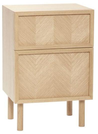 Modern tölgyfa éjjeliszekrény , amely gyönyörű letisztult és természetes megjelenésének köszönhetően minden enteriőrben jól mutat. Különlegessége a halszálka minta, mely a 2021-es év legtrendeibb mintája. Mérete 44x30x60 cm, anyaga tölgyfa. Gyártó: Hübsch